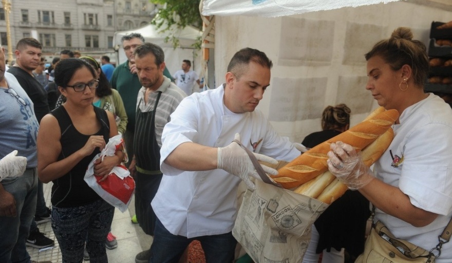 Panaderos bonaerenses reparten frente al Congreso nacional 5000 kilos de pan para protestar por la suba del precio de la harina. Según denunciaron referentes del sector, la bolsa de 50 kilos de harina costaba 270 pesos en enero y ahora el precio trepó a 800.